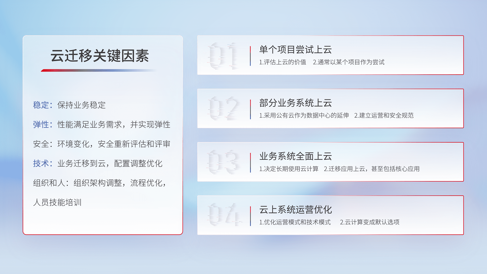 结合实际业务,,,从规划设计、、、、云平台选型、、、、云原生改造、、数据迁移、、、、集成交付,,迁移全过程为客户识别最佳上云路径,,做好风险识别管理,,设计网络架构、、、身份权限、、安全审计合规、、操作审计、、、日志审计、、、监控告警策略、、、、多站点容灾设计等,,,,对云上基础设施进行整体规划,,,提升IT治理水平,,以满足弹性、、、高可用、、、、高性能的需求。。。