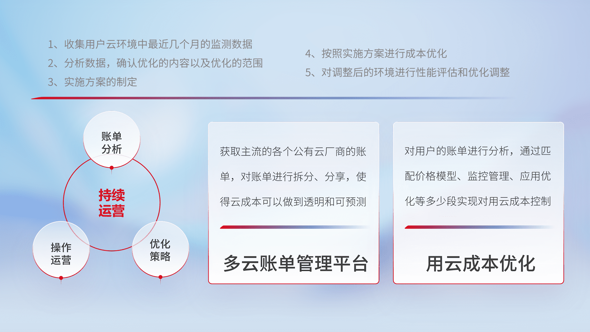 通过灵活运用多种自动化迁移工具,,,帮助企业用户实现业务和数据高效 、、稳定的上云迁移和云上迁移,,采用自研多云纳管平台,,,,以中立管理模式,,,,解决多组织、、、、多云、、多运维厂商的复杂关系的管理,,保证多云平台资源配置的一致性,,,实时掌控云资源运行数据,,运用智能化工具分析云资源多云平台的管理服务,,透明化管理成本支出,,用云成本可预测、、、、用云费用可优化、、、、云资源配额有据可依。。
