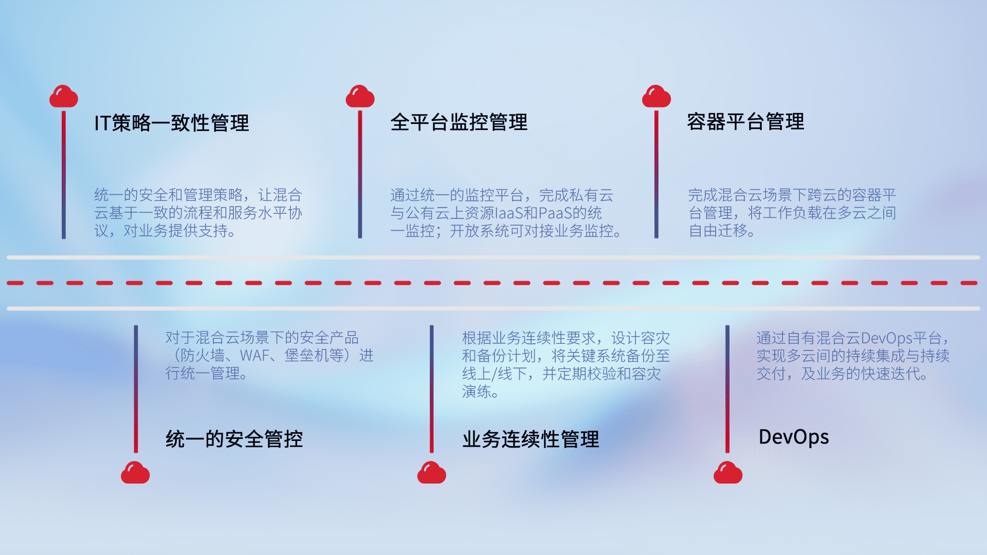通过多云纳管,,,以统一的资源数据模型把客户的云资源进行抽象和封装,,,进而实现对多云资源的统一操作,,,,保障云资源管理的可靠性、、、、稳定性与可用性。。。。量身定制化运维内容,,,,配置、、、、开发运维、、补丁管理、、、、备份、、、监控、、、认证和访问管理、、审计和日常巡检等,,,保障在用云过程中的可靠度,,,,稳定度以及高可用率。。。。