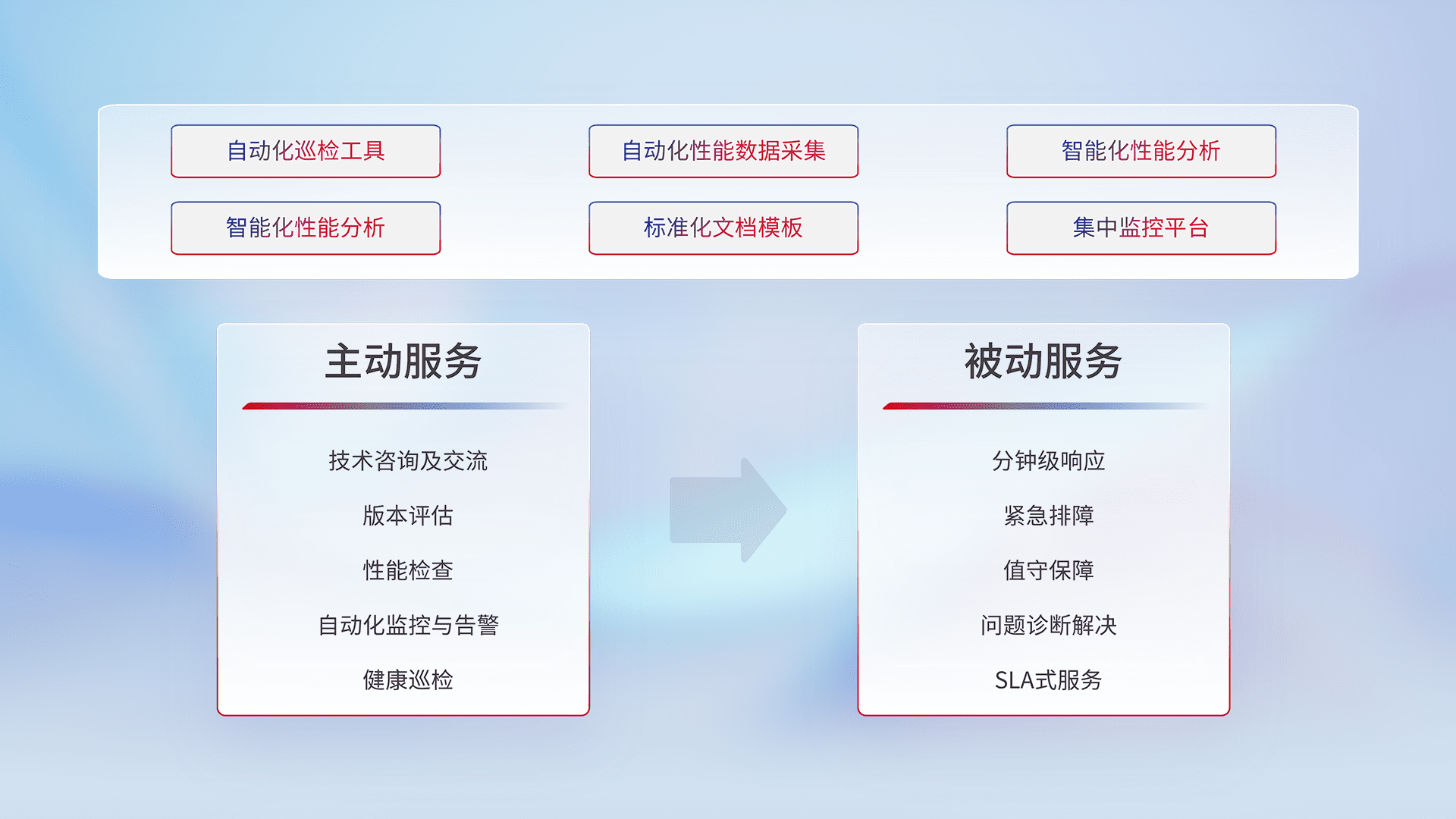 智能化工具和标准化文档,,保障服务质量,,,,提供主动服务(包含技术咨询、、、、版本评估、、、性能检查、、、自动化监控与告警、、健康巡检)和被动服务包含(分钟级响应、、紧急排障、、、值守保障、、、、问题诊断解决、、SLA服务)。。